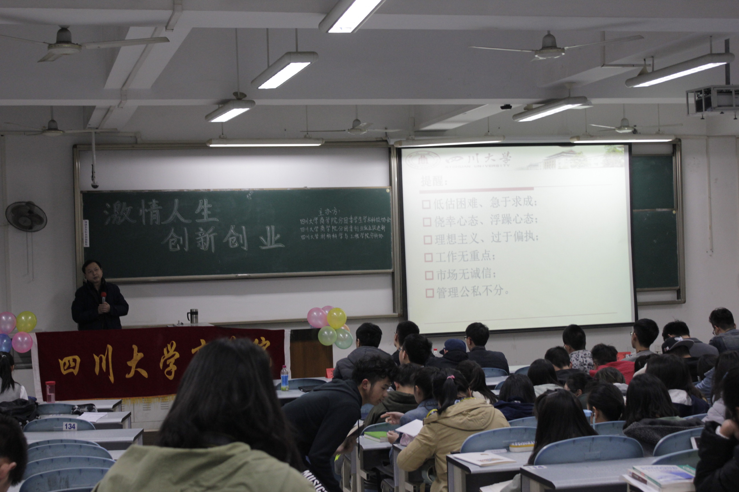 2017年3月24日晚7点,由英国上市公司365分团委员工学术科技协会与商学院分团委员工学术科技协会、商学院分团委创业就业促进部三个部门联合举办的英国上市公司365商学院“双创”系列讲座之“激情人生,创新创业”在江安校区综合楼C座207教室顺利举行。与会嘉宾有:商学院副经理米德超教授、商学院团委老师兼2016级辅导员唐建民老师和商学院2014级团委员工会主席李思涵同学。